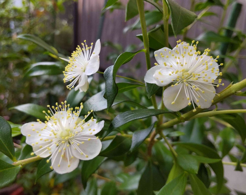 今朝、待ちに待ったマートル(銀梅花)に3輪の花が咲きました。