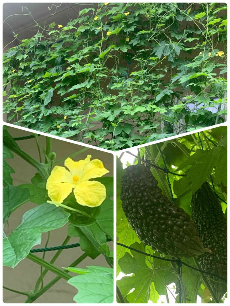 実家のゴーヤのグリーンカーテンに花も実もなってました🌼