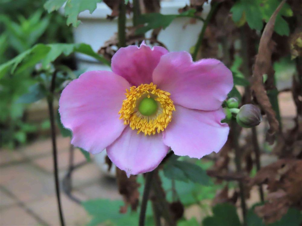 お花の横に蕾が見えているので、この「シュウメイギク」さん、気温の変化に敏感で、フライングしたようですね。😄