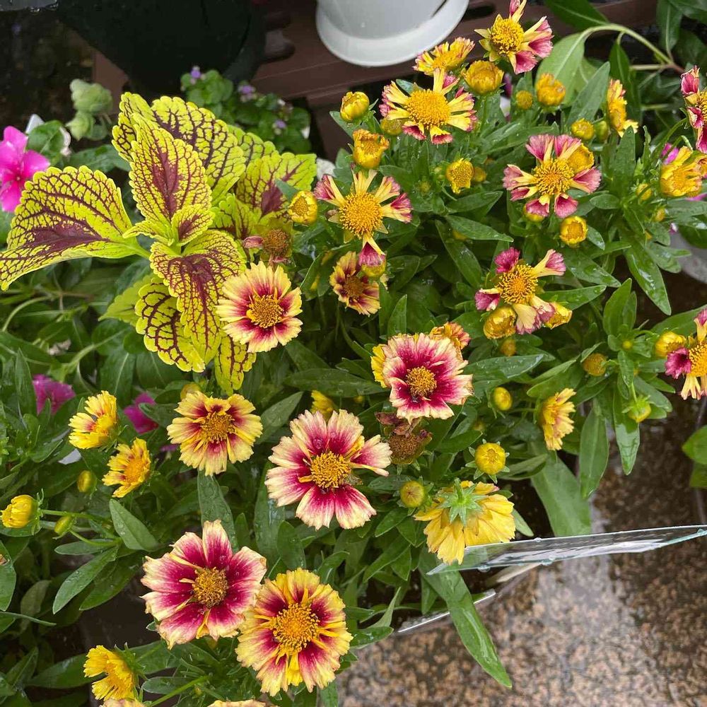 本当はコレオプシスだけでも、大鉢に植えるとボリュームが出て良いけれど、同系色のコリウスをひとつ入れてみました😃