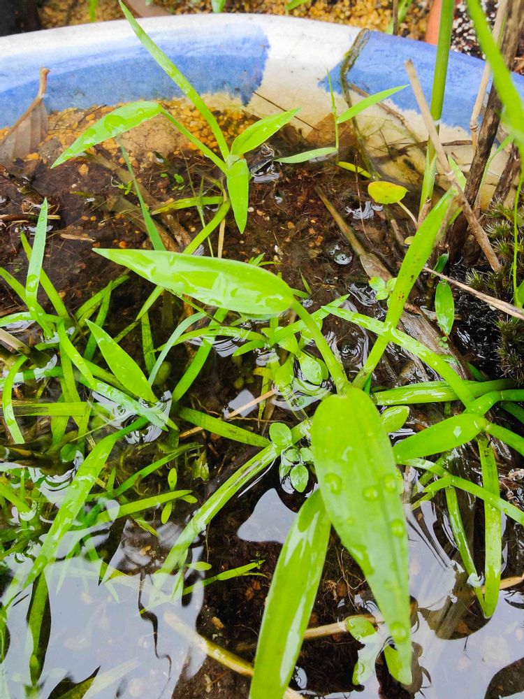 何が出るかな何が出るかな?睡蓮鉢に睡蓮は無く何か水草が待っていたらどうもヘラオモダカに似てる少し土を減らして小さめの睡蓮入れてメダカを入れてみよう〜