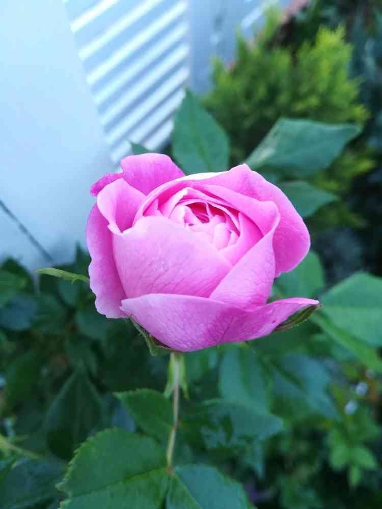 昨年長尺苗で植え付けたラ・レーヌ・ヴィクトリアの一番花が咲いてきました。