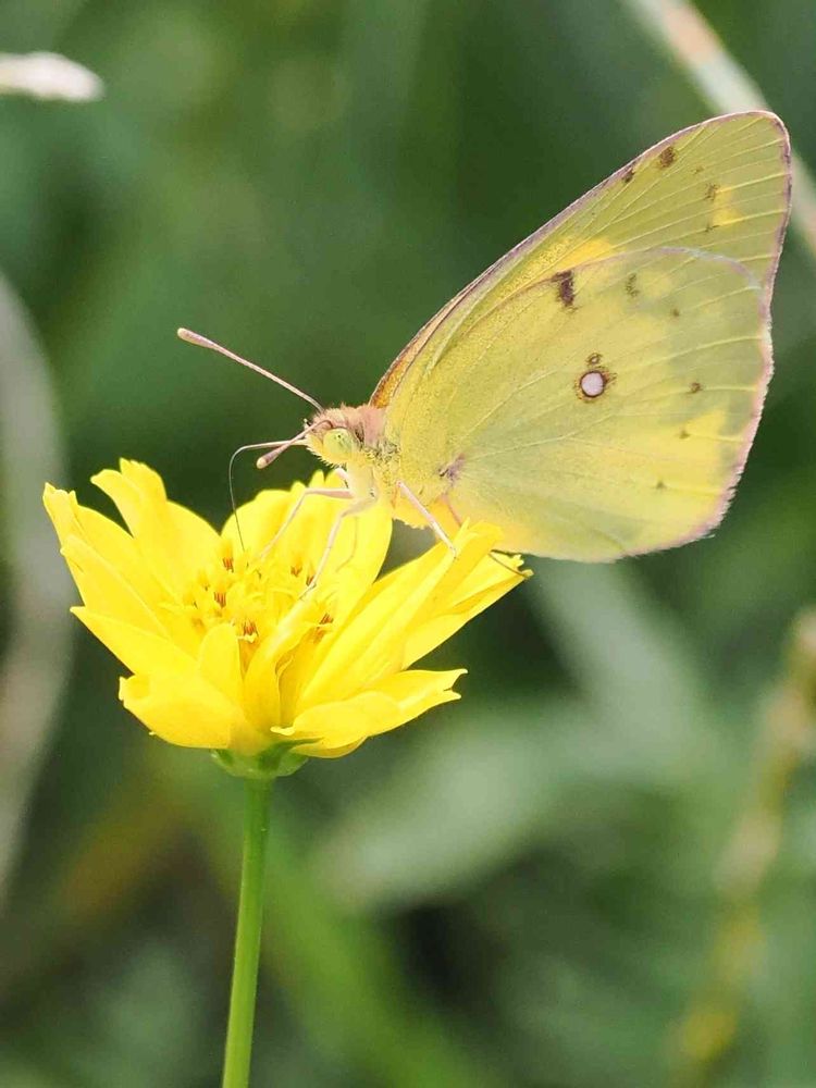 黄色いキバナコスモスに来ていたのは、黄色いモンキチョウ💛