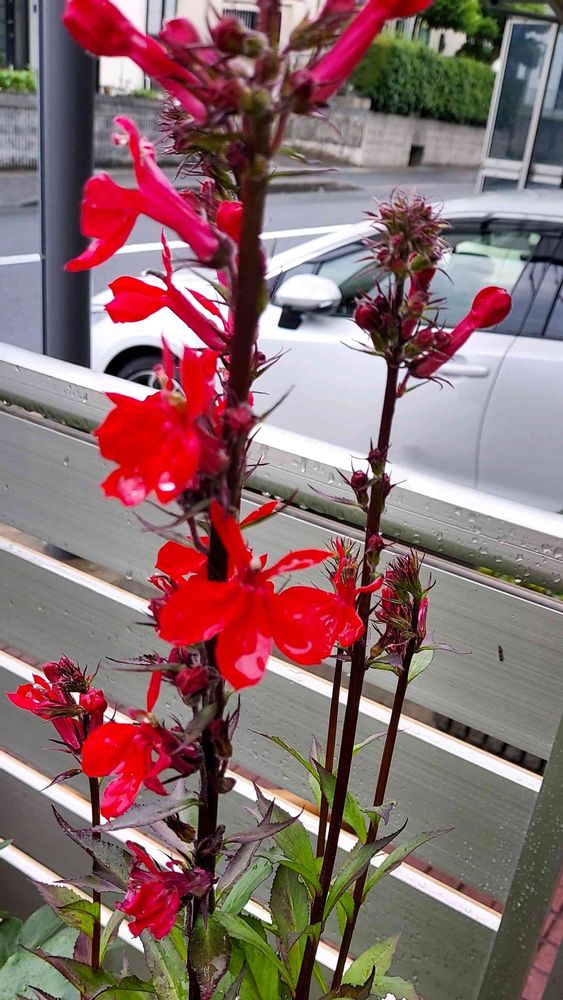 シュッと、花茎を伸ばして見事な真っ赤なお花、ガウラに似た蝶のようなお花。
