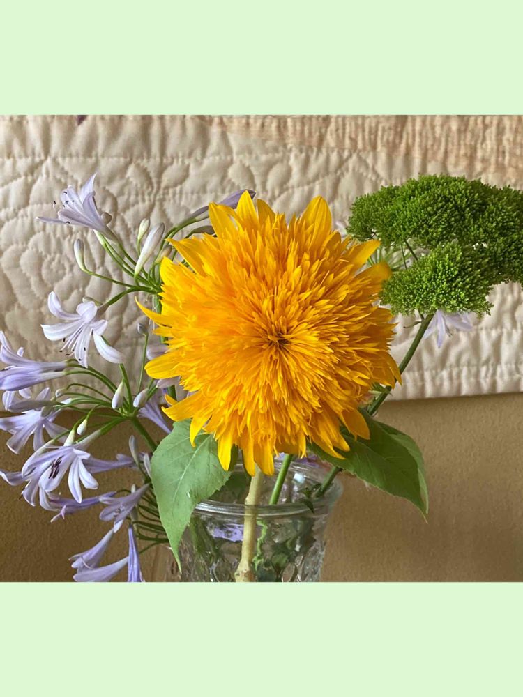 切り花の夕霧草とヒマワリを買いました。お花屋さんが切り花で紫色が多いけどグリーンは珍しいと言ってました。アガパンサスは横に倒れるように咲き、お隣りの車の出し入れに邪魔になると思いカットしました。