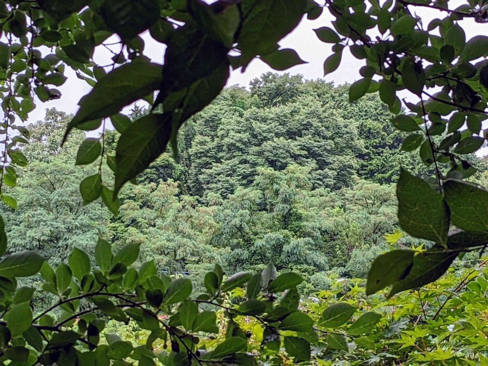 雨が止んで今朝デッキ端から眺めた向こうの山…瑞々しい緑です