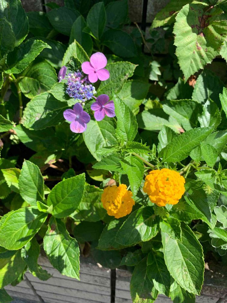 最後に咲いた小さなガクアジサイ💜と今が盛りのキバナランタナ💛😊