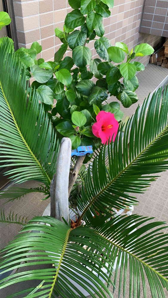 朝から雨が降ったりしてたけど今はめっちゃ晴れてて気持ちよさそう🌺ハイビスカス🌺#ソテツ#蘇鉄#ハイビスカス#🌺