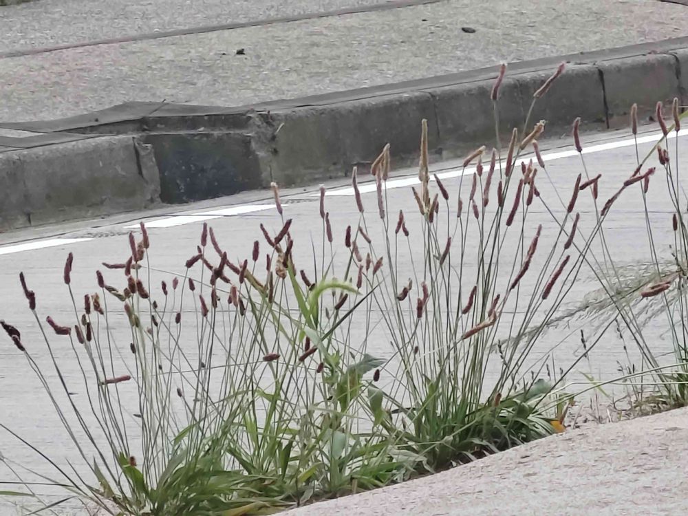 アスファルトと歩道の隙間に咲くヘラオオバコ