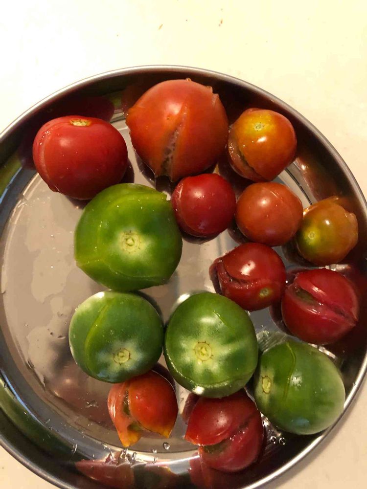 梅雨のような雨続きでトマトが実割れ😢もったいないので冷凍してから、煮ます