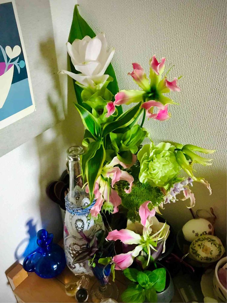 お部屋の隅っこも明るくなりましたね。白いのはクルクマかな?。ブルーのガラスビンの影がいい仕事してますよ。お仕事ご苦労様です💪