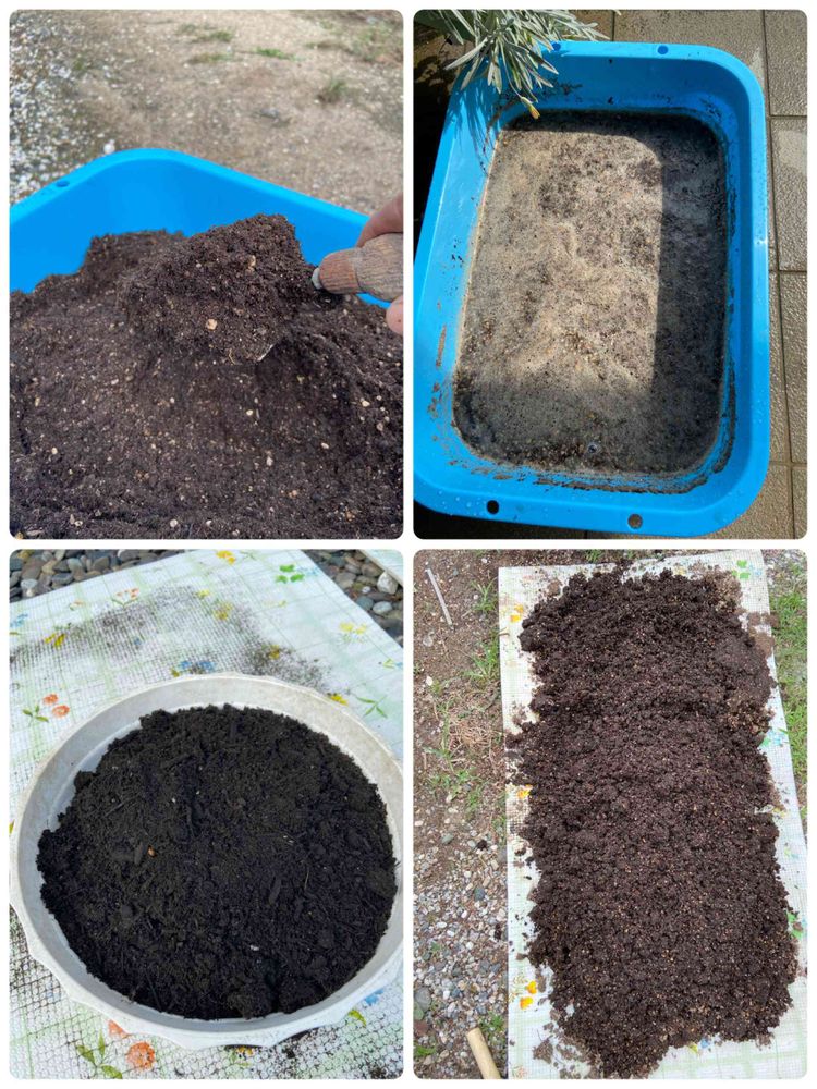 古い土をふるいにかけて、根っ子と葉っぱを取り除きます。
