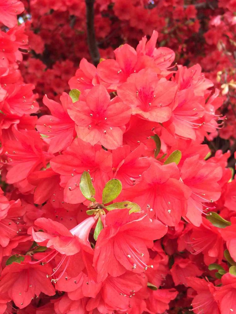 会社の帰り道の道端に咲いていた真っ赤なツツジ、よく見ると真ん中のヒゲの先端が金色の玉になって輝いていました。(´∀`*)