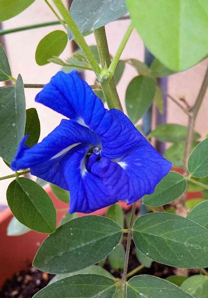 青いマメ💙美しい八重咲きの花に魅了され育てて見ました一重咲きは中心が黄色で綺麗です✨蝶のように舞う花蝶豆💙当分楽しめそうです😊