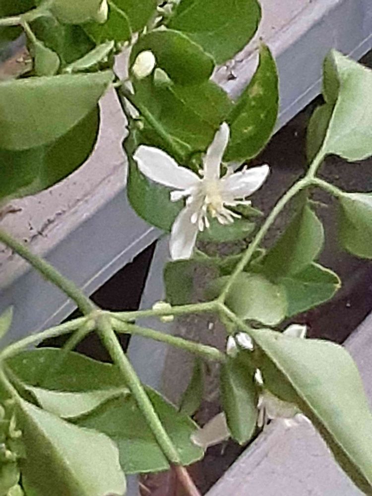 お星さまのような真っ白🤍可憐な蕊ツンツンの花と真っ白な真ん丸の蕾が、今、うちの玄関先に下がっています。嬉しい🎵😍🎵ような、でも、自然のままにしておいてあげたかったという後悔の気持ちとが混ざり合って、とても複雑な私の心( -。-) =3