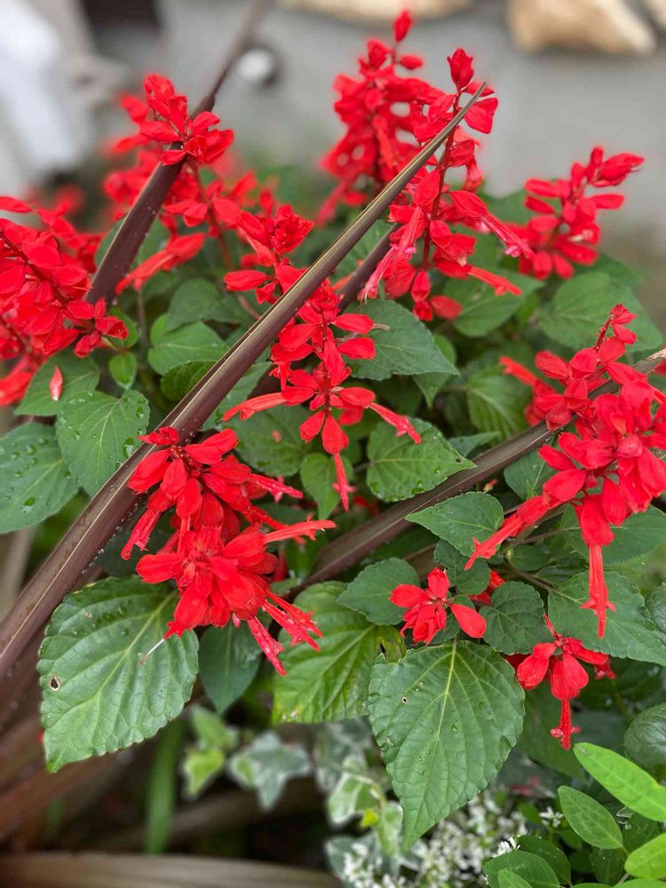 冬越しした赤いサルビアがまた去年同様元気に咲いてます。鉢も土も去年のまま💦しかも春からは花壇に置いて雨ざらし状態。コルジリネが横からビュンビュン突き刺さる勢い😅