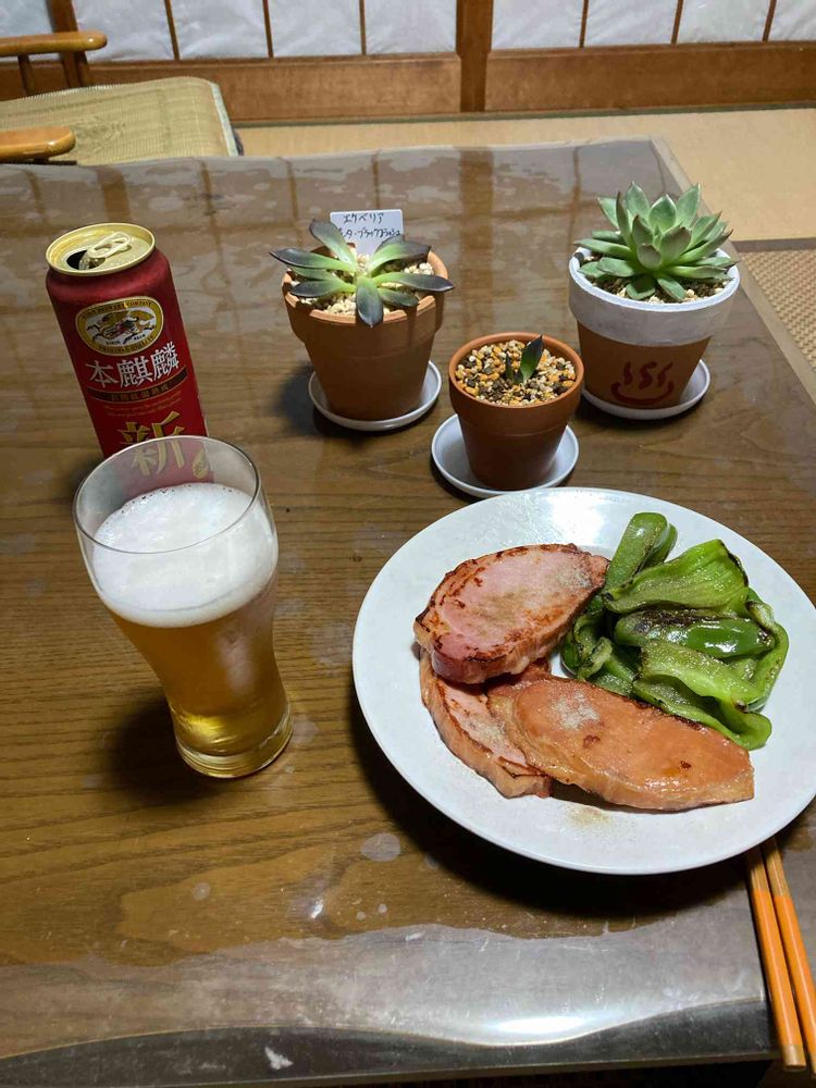 ロースハムステーキとピーマン焼き(笑)