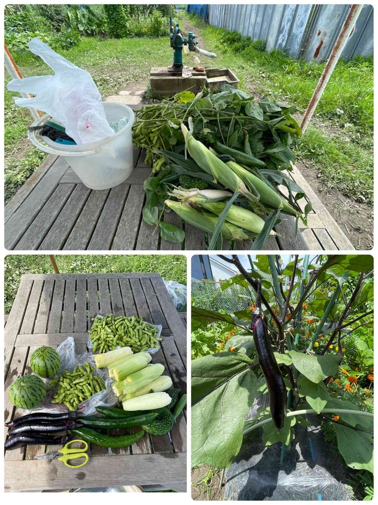 トウモロコシ ホワイト味来、南竜本長茄子、枝豆湯上がり娘、小玉スイカ🍉「薄皮シャリシャリスイート、スーパーゴーヤ、キュウリうどんこつよし2本、四葉キュウリ1本を収穫しました。