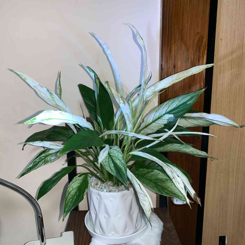 斑入りスパティフィラム、買って植え替えたときちょっと鉢が小さくてきつかったのですがやっぱり育ってくるとバランスも悪く…😅