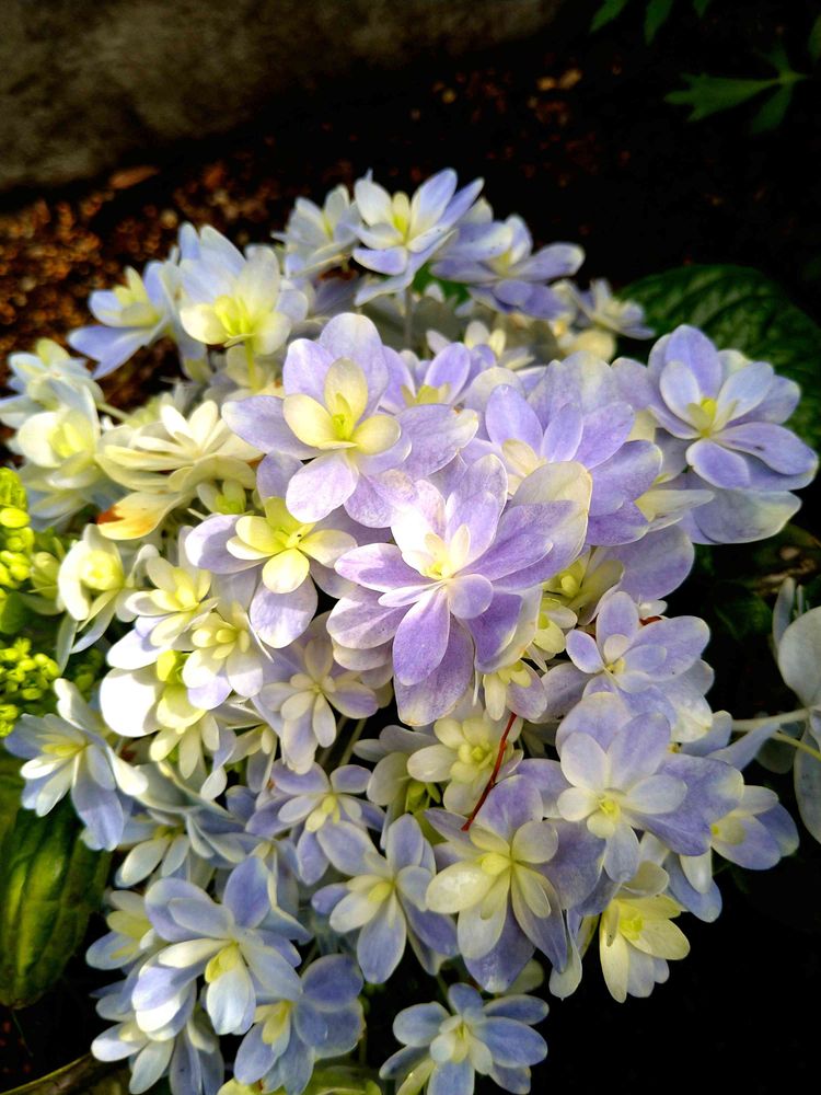 アジサイ万華鏡 鉢植えで頂いたのを花壇に下ろしました。朝日を浴びて気持ち良さそう🌅
