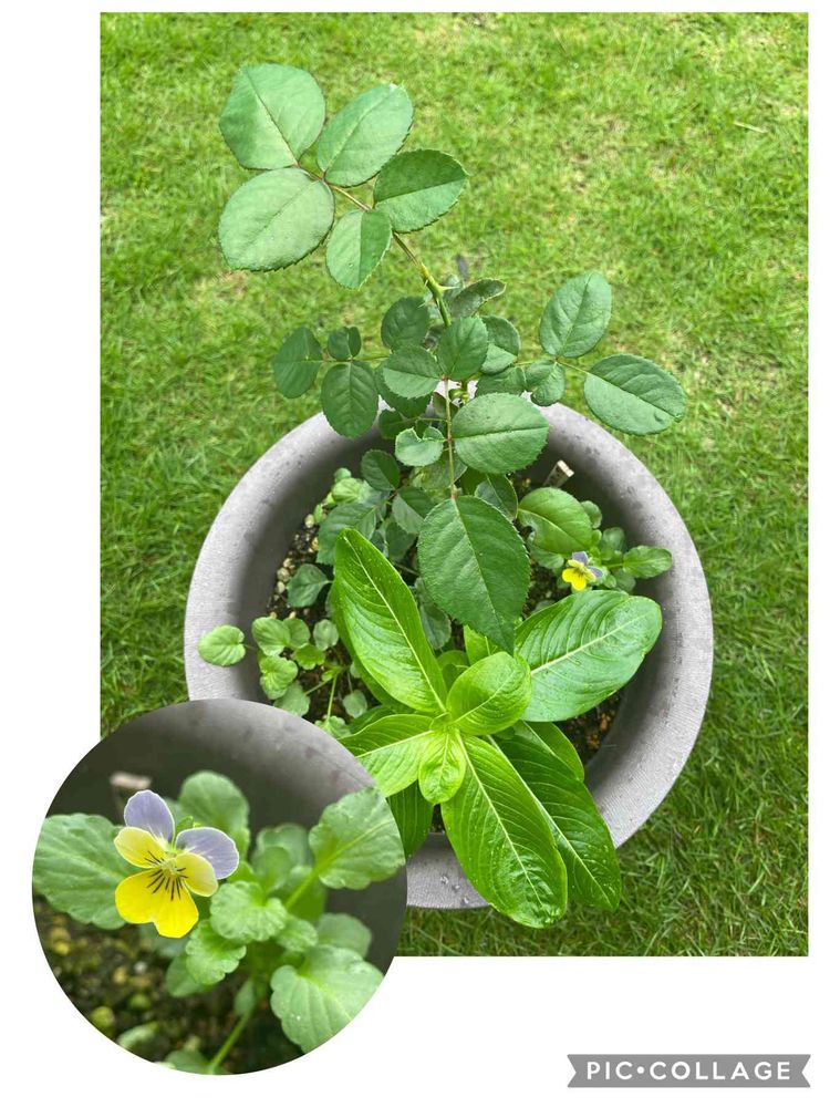 薔薇の挿し木っ子が植えてある鉢に零れ種で咲いたビオラのお花が✨✨✨こんな暑い時期に咲いてくれて感動した〜∵゚。・(。´ノω・`)。゚∵ウウゥゥ