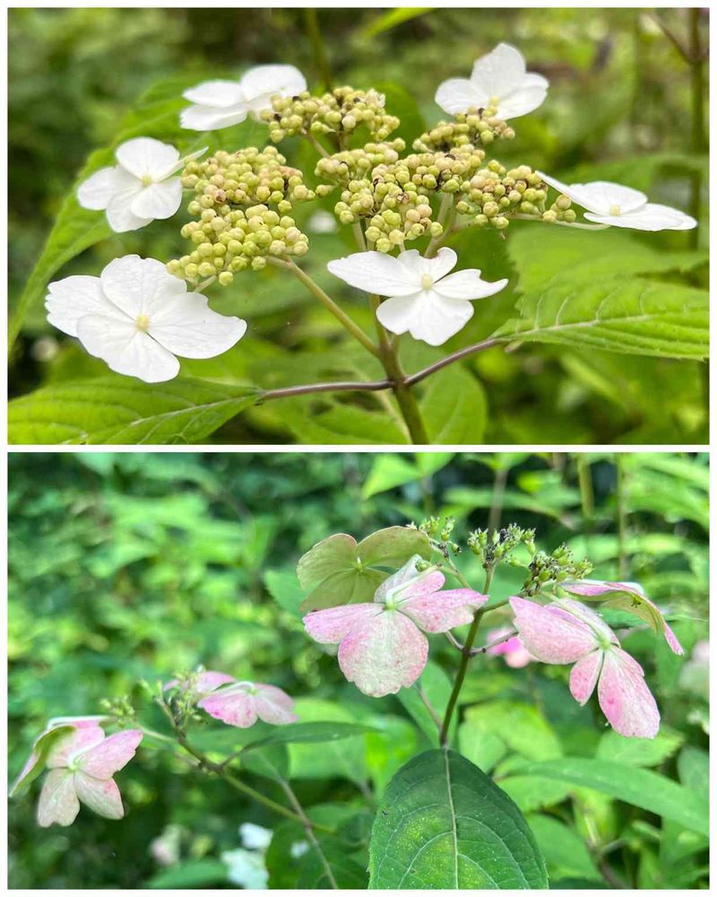 装飾花の萼は3〜5枚で、白から青色を経て、咲き終わりに紅色を帯びる。