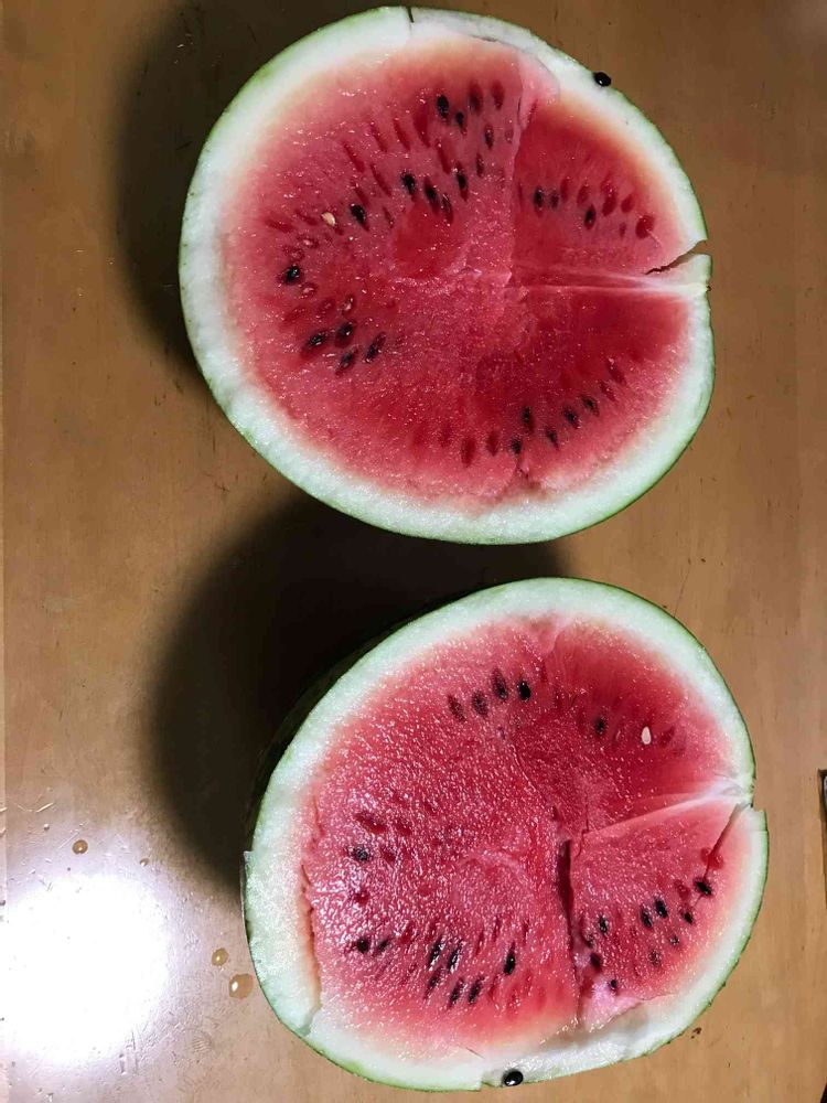 西瓜を一つ収穫しました。家を3日ほどあけた隙に少し小さい一つの西瓜は駄目になっていました。良く見たら、熟れ過ぎではなく、一部だけ穴が開いているので、カラスに突っつかれたみたいです。今日焦って一番大きな西瓜を収穫しました。包丁をいれてみると、自ら割れてきました。あと2.3日置いた方がよかったかもしれませんが甘さもまあまあでした。