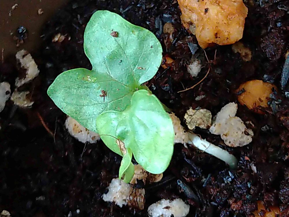 種を一晩水につけ、指一節半ほどの穴に入れ覆土した。小学生になったようで、毎朝鉢の中を覗くのが日課になった。