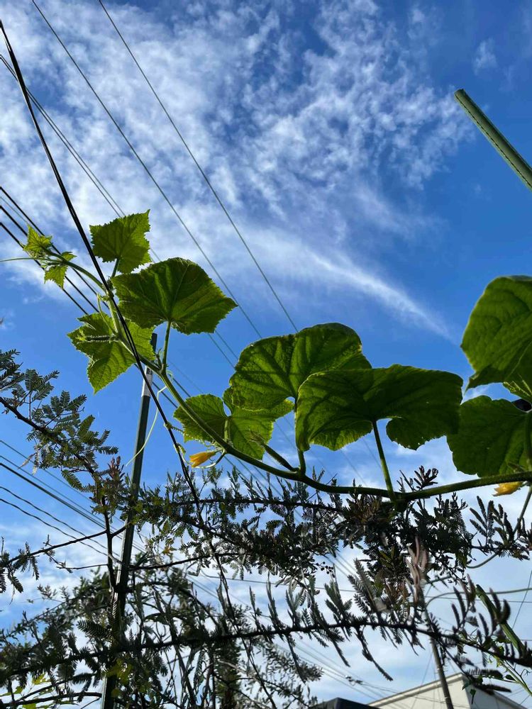 🥒キュウリがミモザに登り始めました