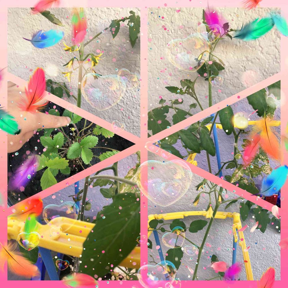 左真ん中には、いちご🍓の花が落ちて🌼、実(?)のようなものができた!右真ん中には実ができてきた!〈トマト🍅)他全部は、お花ぁ🌼