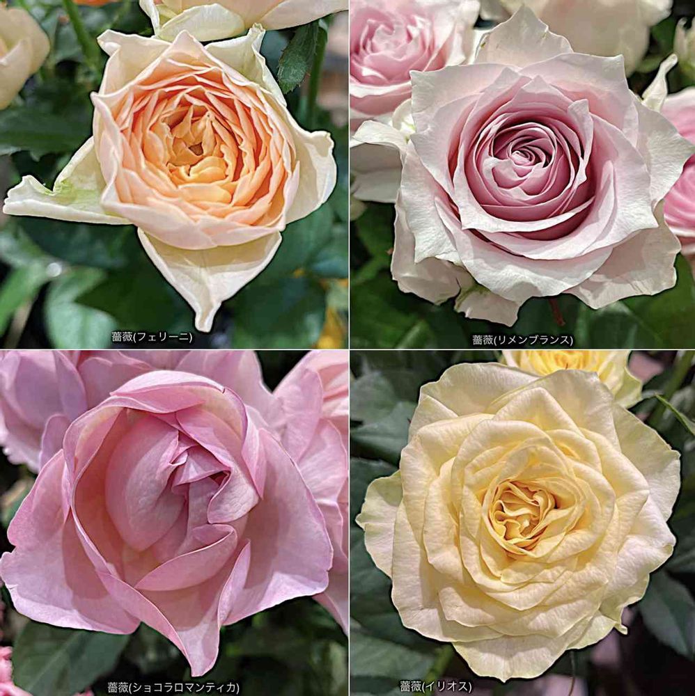 複色(混色)系x1、紫系x1、ピンク系x1、黄色系x1のバラ、4つ。