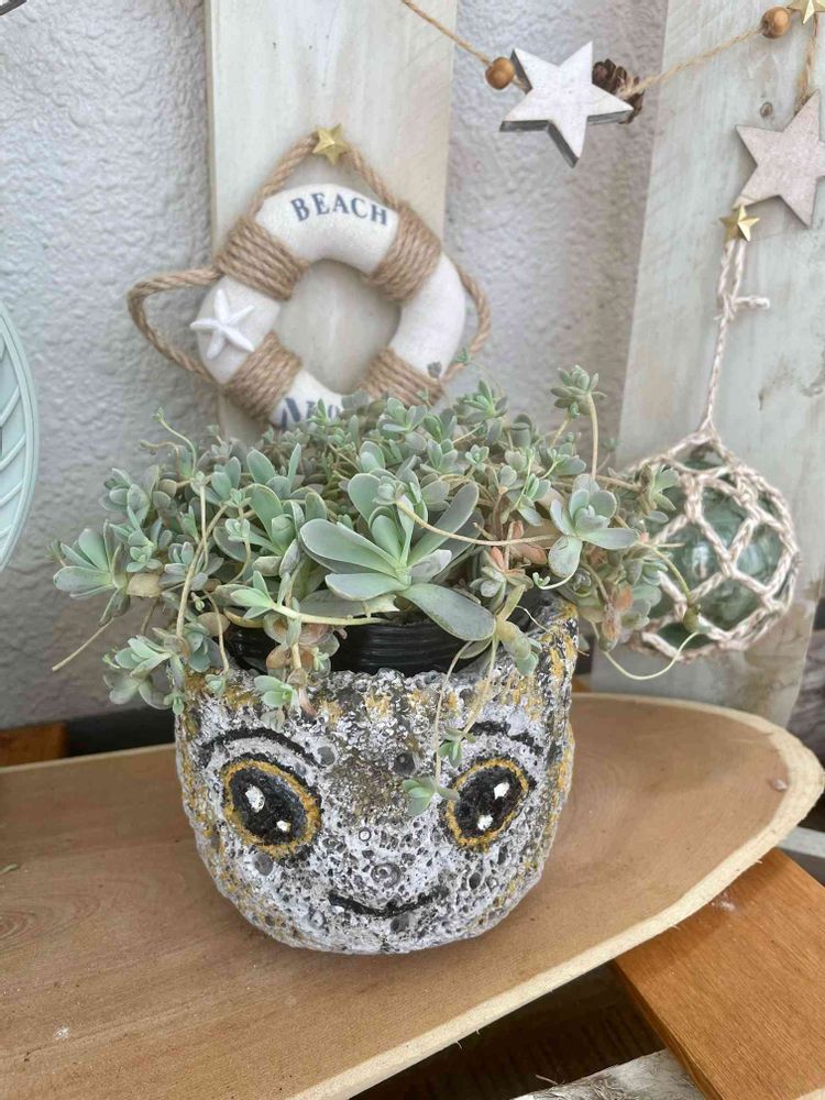 パパが道の駅で買ってきた子持ち蓮華ちゃん、200円だったらしい😅パパが描いた顔がついたこの鉢植えたいけどぴったりすぎてあふれちゃうよね。でも似合いすぎ🤣半分こにして植えようかな。