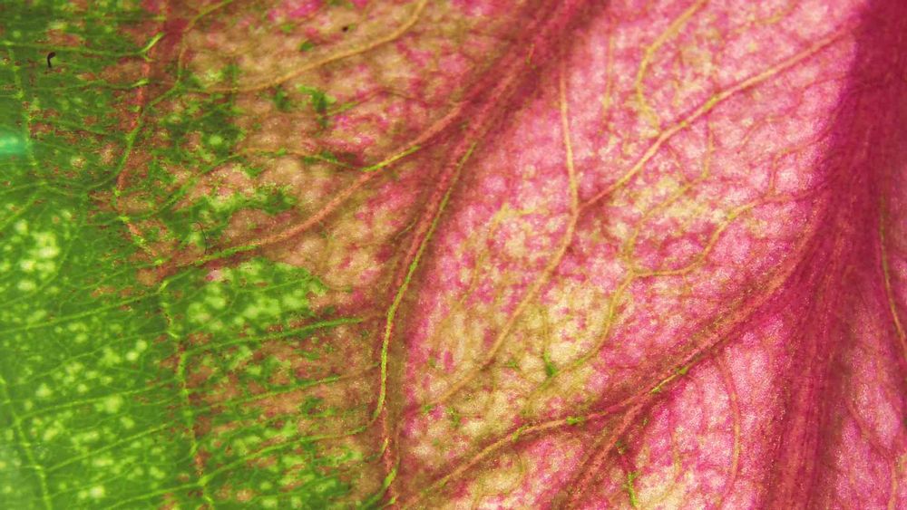 カラジウムさんの赤と緑の境界あたり。ちょっと顕微鏡で覗いてみました。