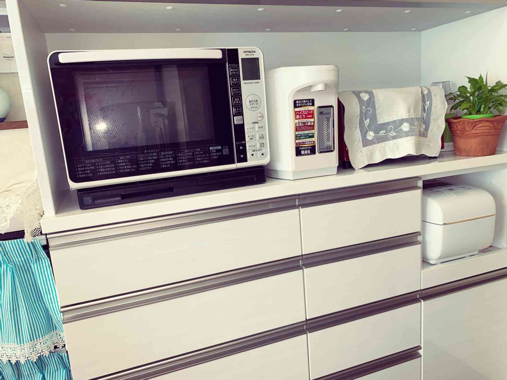 キッチンボードに並ぶ家電で、後はトースターが白🤍でない。