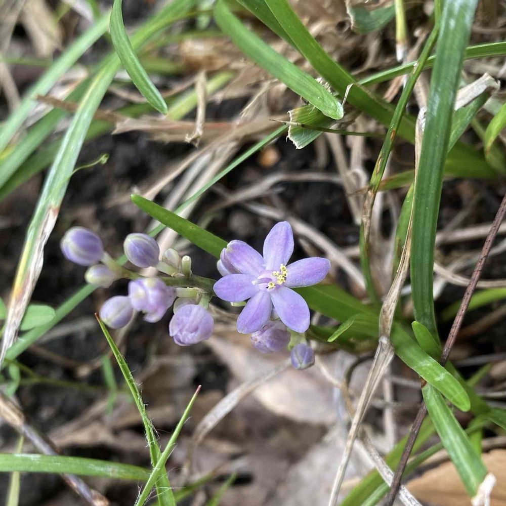 リュウノヒゲに似た細長い草に隠れ、日頃から気にしてないと、そこに咲いているのかさえ気が付かない大きさ。見つけた時はなんだか嬉しかったな(*ฅ́˘ฅ̀*) .。.:*♡