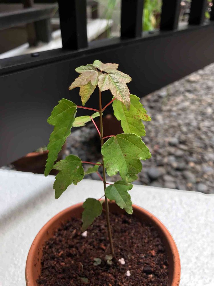 もうすぐ工事が始まる空き地で、楓?の実生を見つけて"連れて帰り"ました。今12cmです。