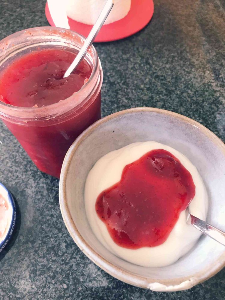 カテリーナが作ったいちごジャム この前ギリシャのお土産を持って来かたがたお見舞いにこれを持って来て。朝ご飯のヨーグルトにかけて食べたら美味しかった。高校の時に自身もバスケ🏀で鼻の骨を折って大変だったけど大丈夫だった🙆あなたも大丈夫と慰めてくれて。可愛い子です💕