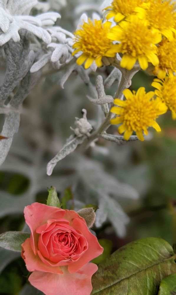 シロタエギクの黄色い💛お花とミニバラ🌹さんの色🧡がとても素敵ですね。