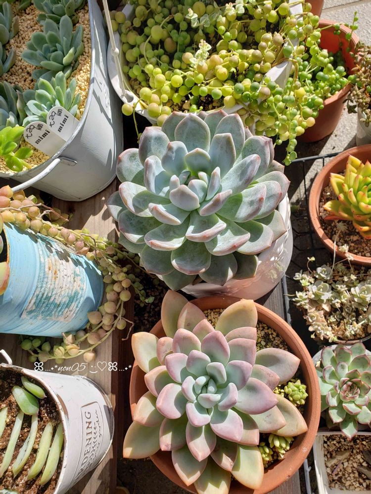 多肉さん達、日差しを浴びて気持ち良さそう〜(*^ワ^*)💓 さっき外に出たら風があったから、お水をあげました〜😃 明日も風があるらしいから、