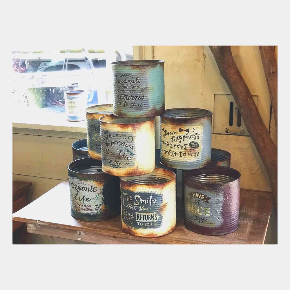 大きなトマト缶にmaiさんが一つ一つ丁寧にシャビーな錆び錆びペイント。缶には底穴が開いているのでアレンジメントが終わった後は多肉植物や観葉植物などを植えてもOK❗️