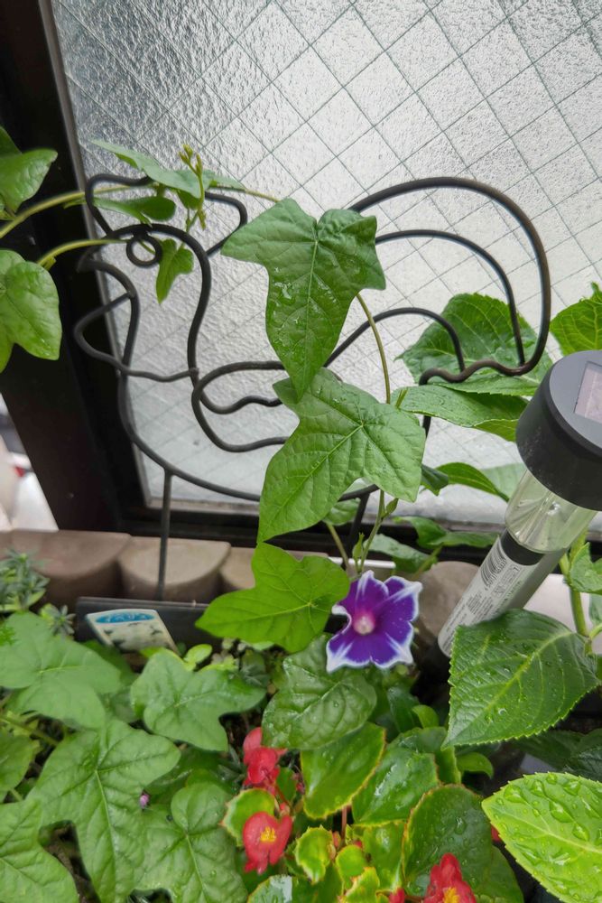 育ちの悪い朝顔の苗、捨てるのも、と鉢の片隅に。