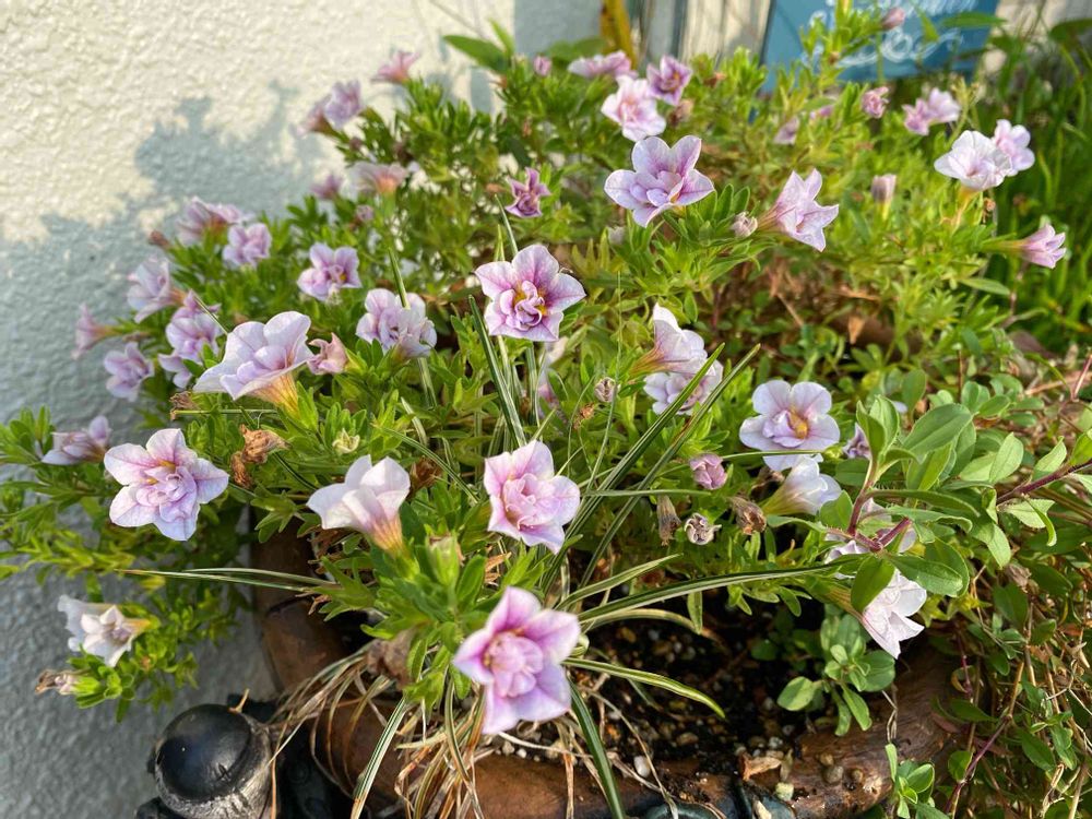 日向のグレープフリルは色が薄くなってきましたが雨ざらしでも咲いています