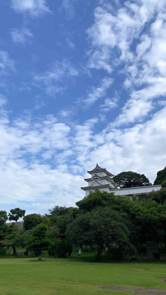 今朝の青空。明石公園の芝生広場から、城跡の櫓を入れてみました✨
