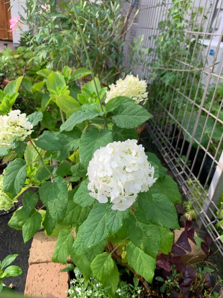 挿し芽で増やしたアナベルは北側のせいなのか今ごろ見頃を迎えてます。小ぶりで可愛い😍