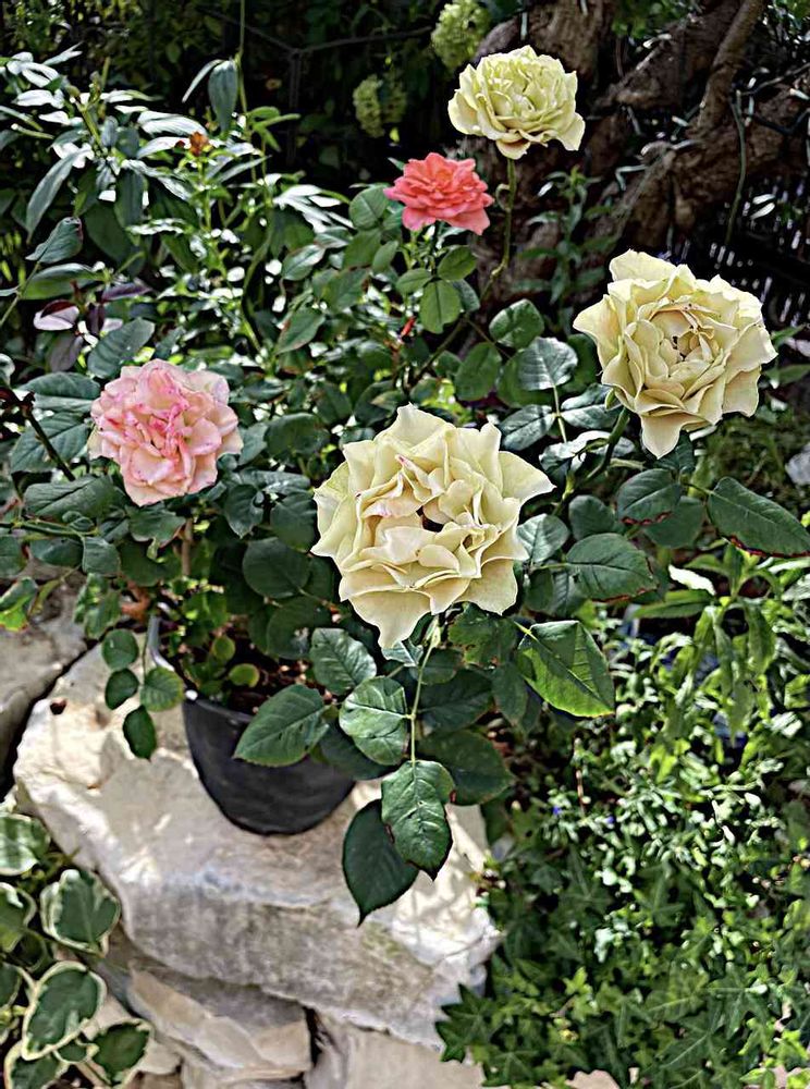 カタバミさんのお出かけ先,バラ(薔薇),/ピンクのクリームイエローの花達、白い庭石にのる鉢の中/の投稿画像