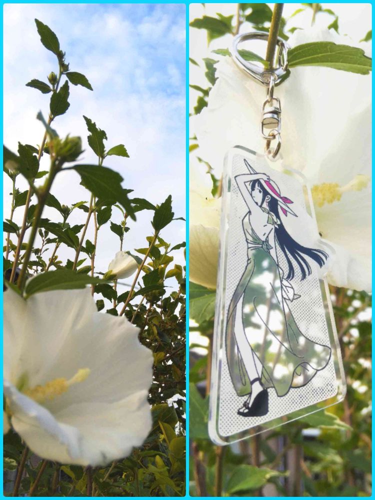 上の方から白いムクゲが咲き始め、ももこさん眩しそう*°✨パレオスカート透けました*°♡