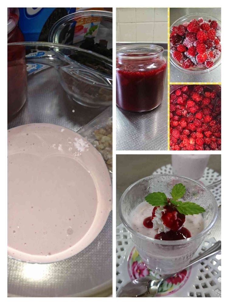 キレイなピンク色のアイスクリームに生クリーム、ブラックベリージャム、庭で摘んできた