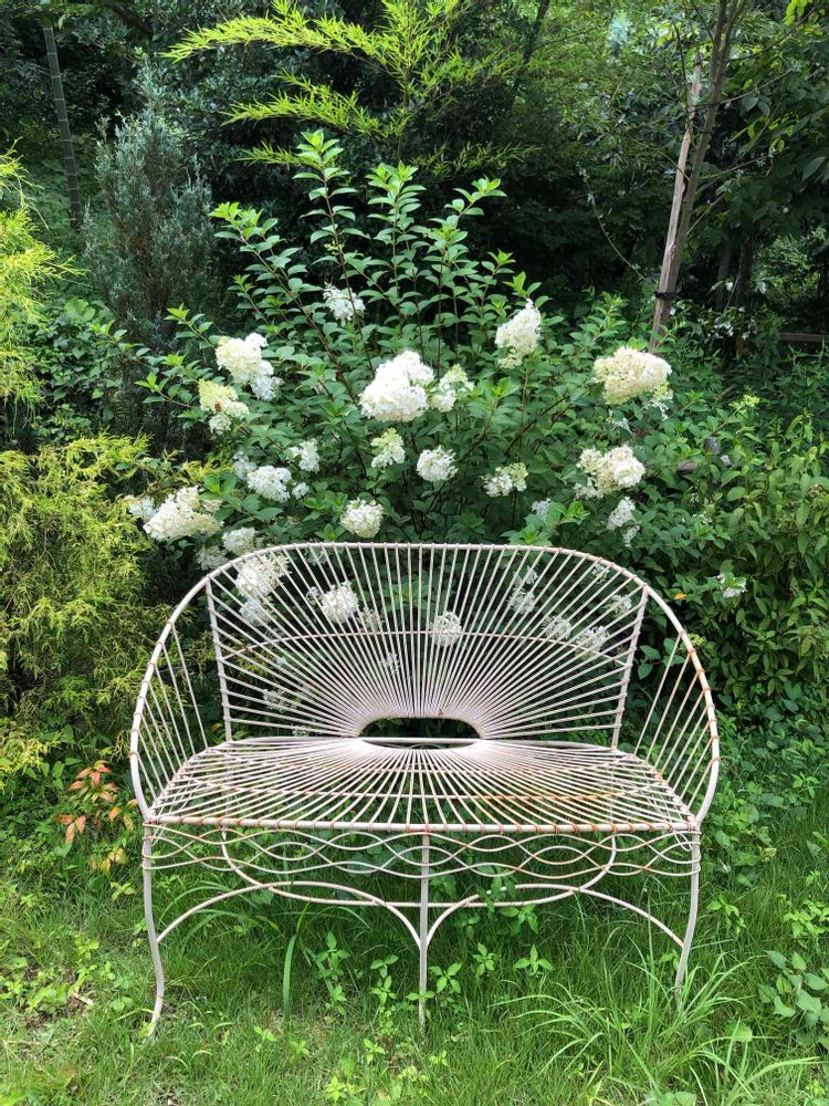 お洒落なアイアンのベンチ✨の後ろに咲くノリウツギ🌿🌼🌿