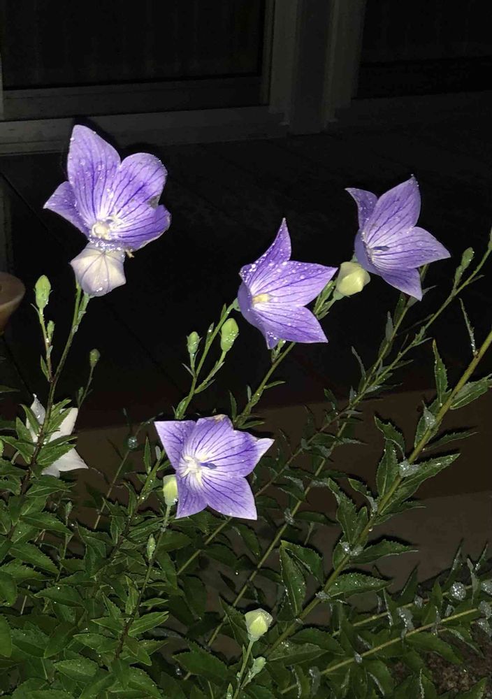 夜の庭、桔梗がポツポツ咲き始じめました。