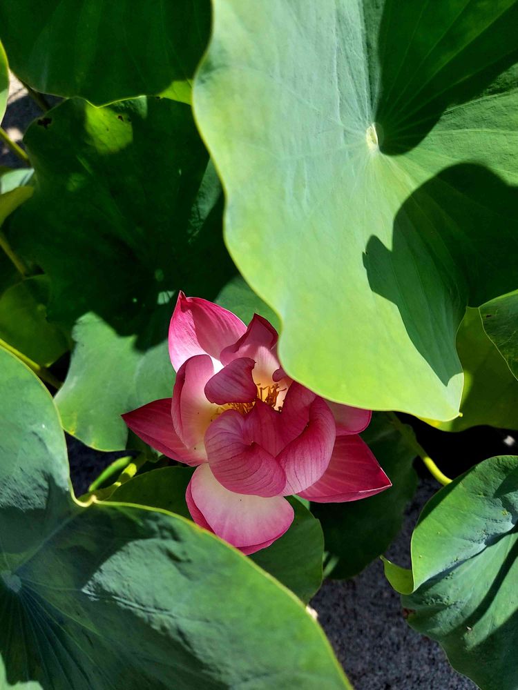 大きな葉の間に挟まれながら低いところで見え隠れしたハスの花が下から灯り💡を照らしてるかのように見え綺麗でした💖
